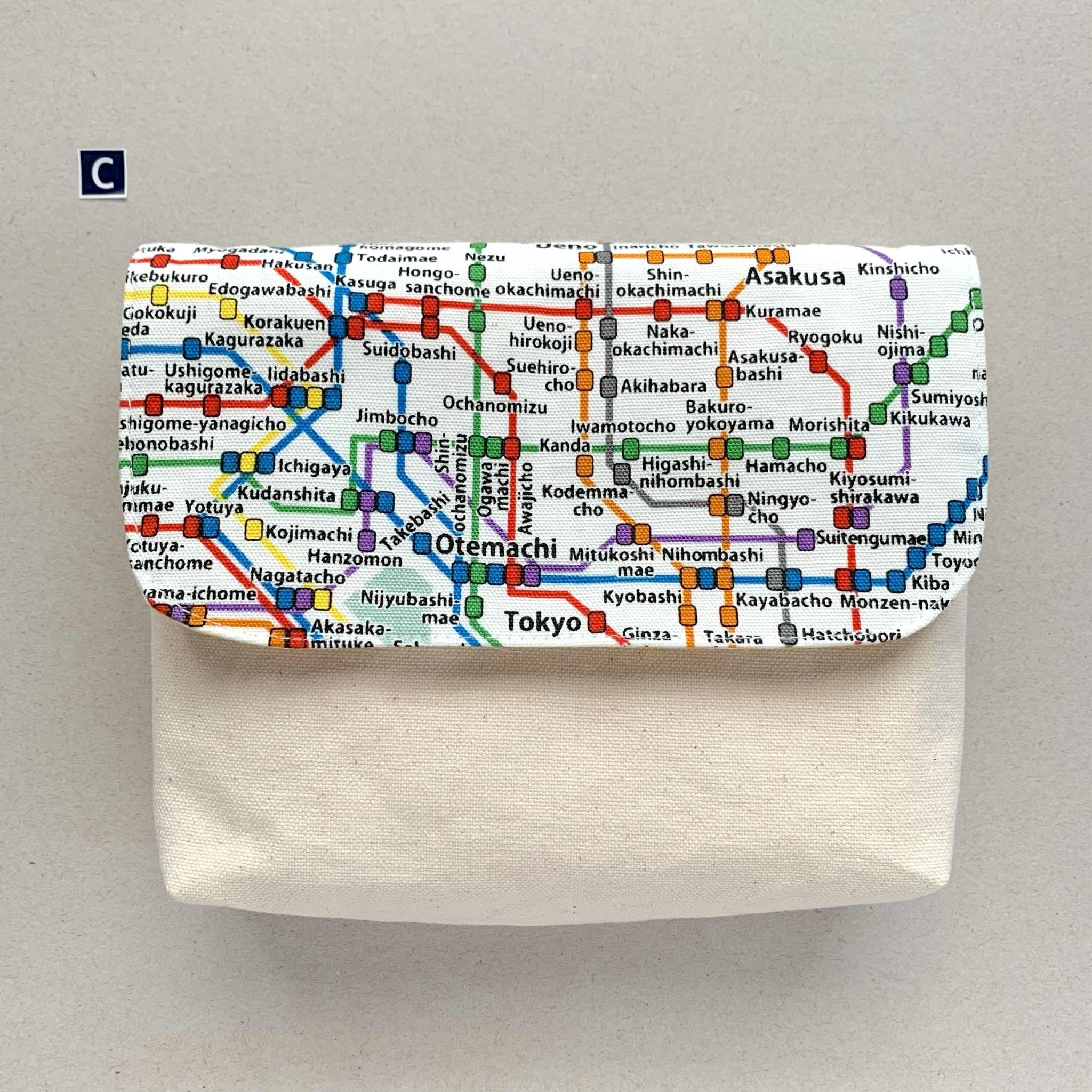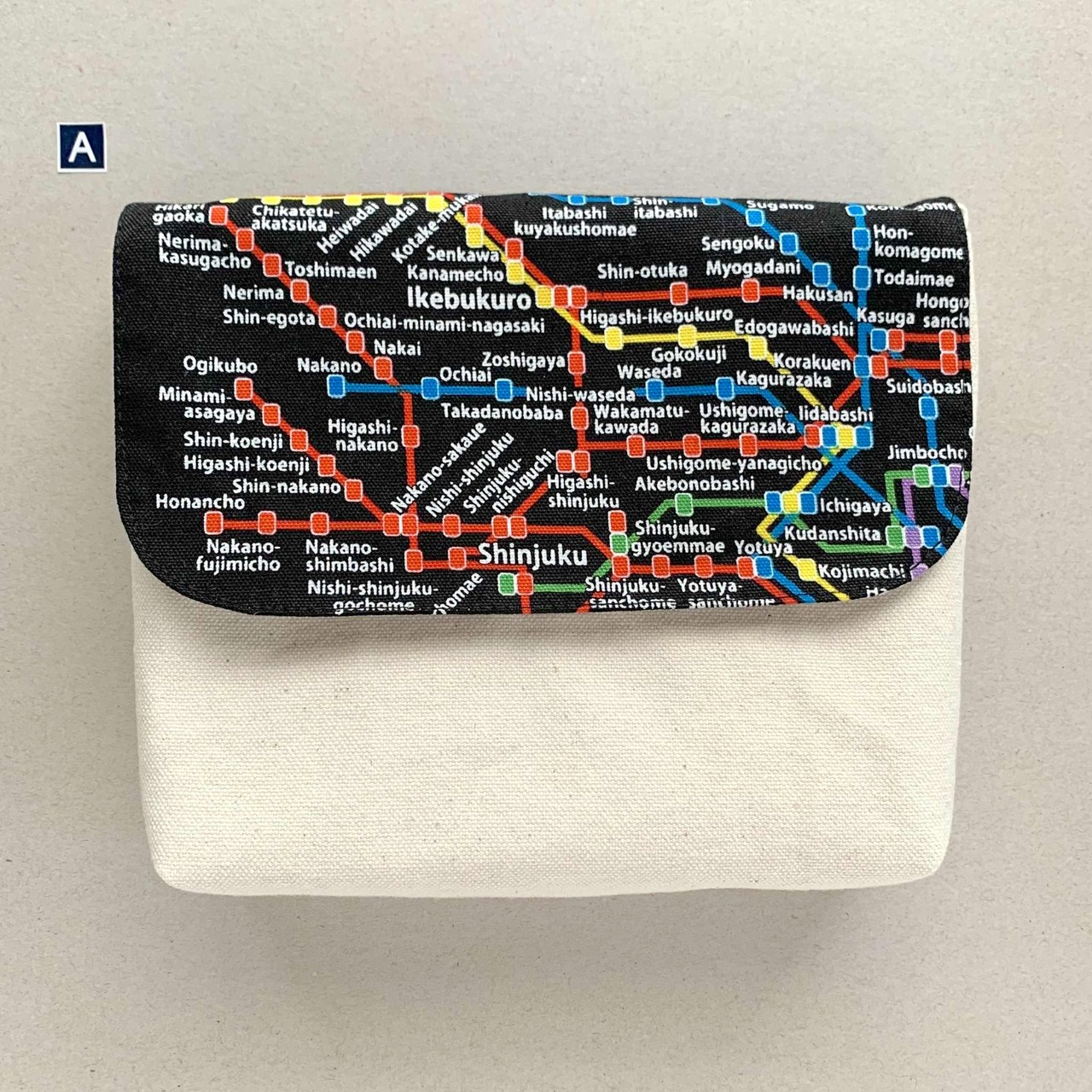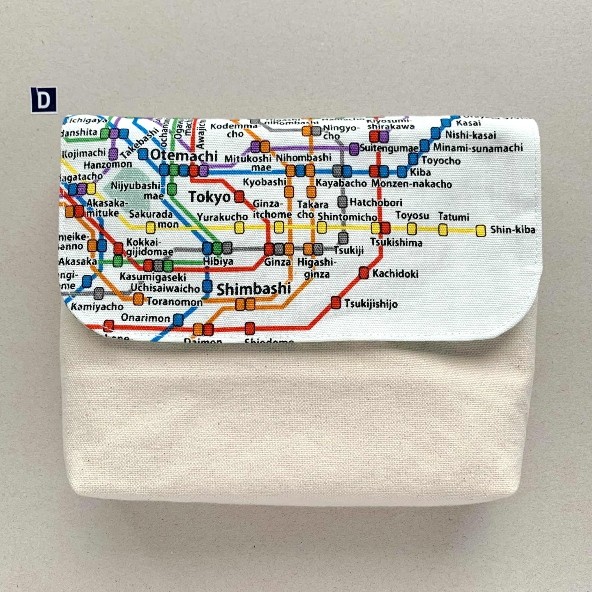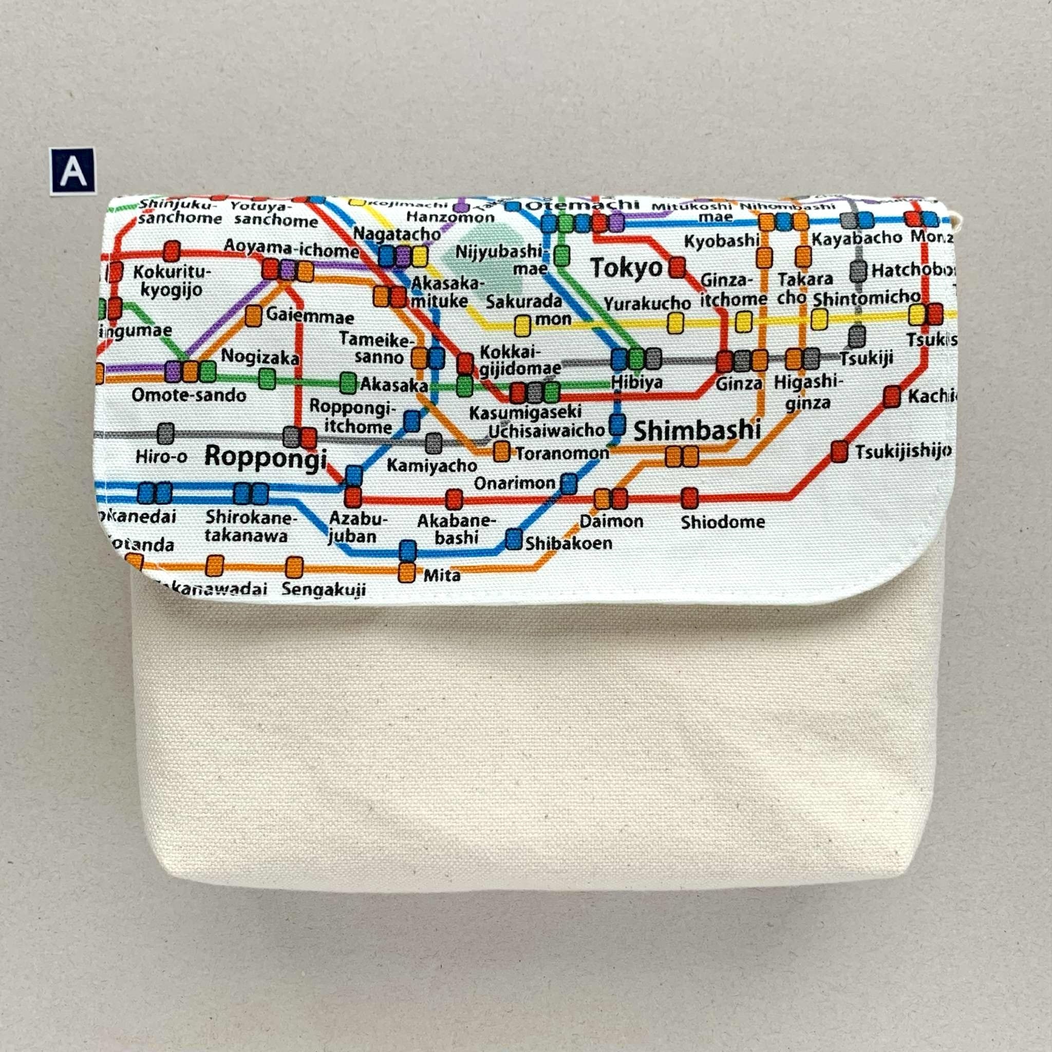 フラップ部分に東京メトロの路線図柄の生地を使ったポシェット